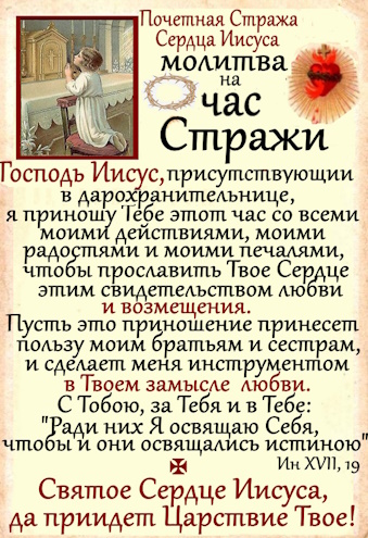 «Час Стражи» заключается в том, что в течение одного часа дня, мы предлагаем свои дела с желанием утешить Святейшее Сердце Иисуса, которое в наше время терпит столько оскорблений и пренебрежения по всему миру.